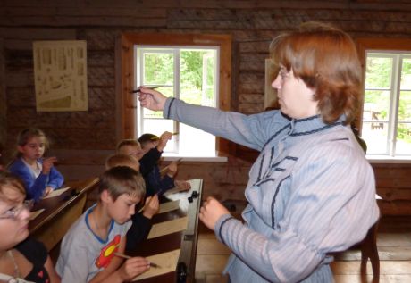4-й день. Эстонский музей под открытым небом. Эйнике Соовяли - учительница в школе показывает как правильно держать перо. Фото П.Алексеева